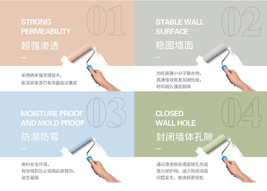 與普通底漆相比,蒙太奇精裝房專用滲透漆采用納米滲透技術(shù),具有高彈性小分子聚合物,能很好地滲透到墻體的微小孔隙中,從而封閉墻面,防止水分滲透,控制墻體底層水分,抵御霉菌滋生,避免墻面泛堿發(fā)花、粉化、氣泡等情況發(fā)生。