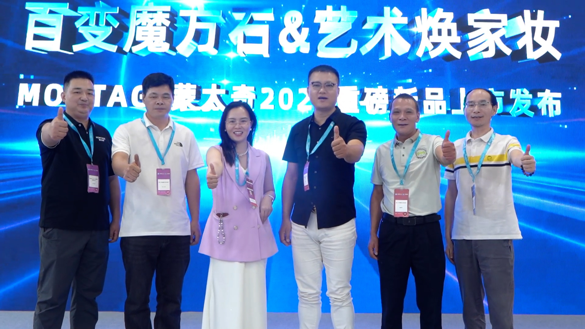 發布會尾聲,蒙太奇CEO 趙廣全先生、順德涂料商會秘書長張夢東先生、媒體代表《藝術內參》總編肖武先生、蒙太奇聯合創始人、藝術涂料最美老板娘呂芳方女士、蒙太奇技術研發總工、蒙太奇生產制造中心副總經理侯立軍先生、蒙太奇市場總監周曉東先生一同上臺,共同進行了新品上市啟動儀式,標志著「魔方石?免膩子質感涂料」正式面向市場。