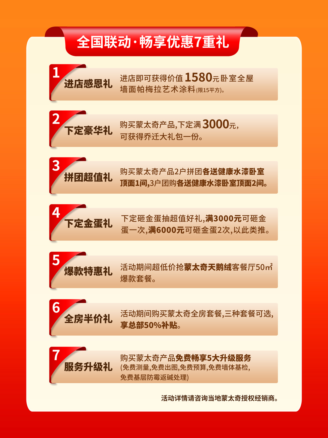 活動(dòng)期間,廠商瘋狂讓利、禮遇享不停,為大家?guī)碚\(chéng)意滿滿的裝修福利。提供「進(jìn)店感恩禮、下定豪華禮、拼團(tuán)超值禮、下定金蛋禮、爆款特惠禮、全房半價(jià)禮、服務(wù)升級(jí)禮」等多重升級(jí)豪禮。(更多活動(dòng)詳情請(qǐng)咨詢當(dāng)?shù)孛商媸跈?quán)經(jīng)銷商)
