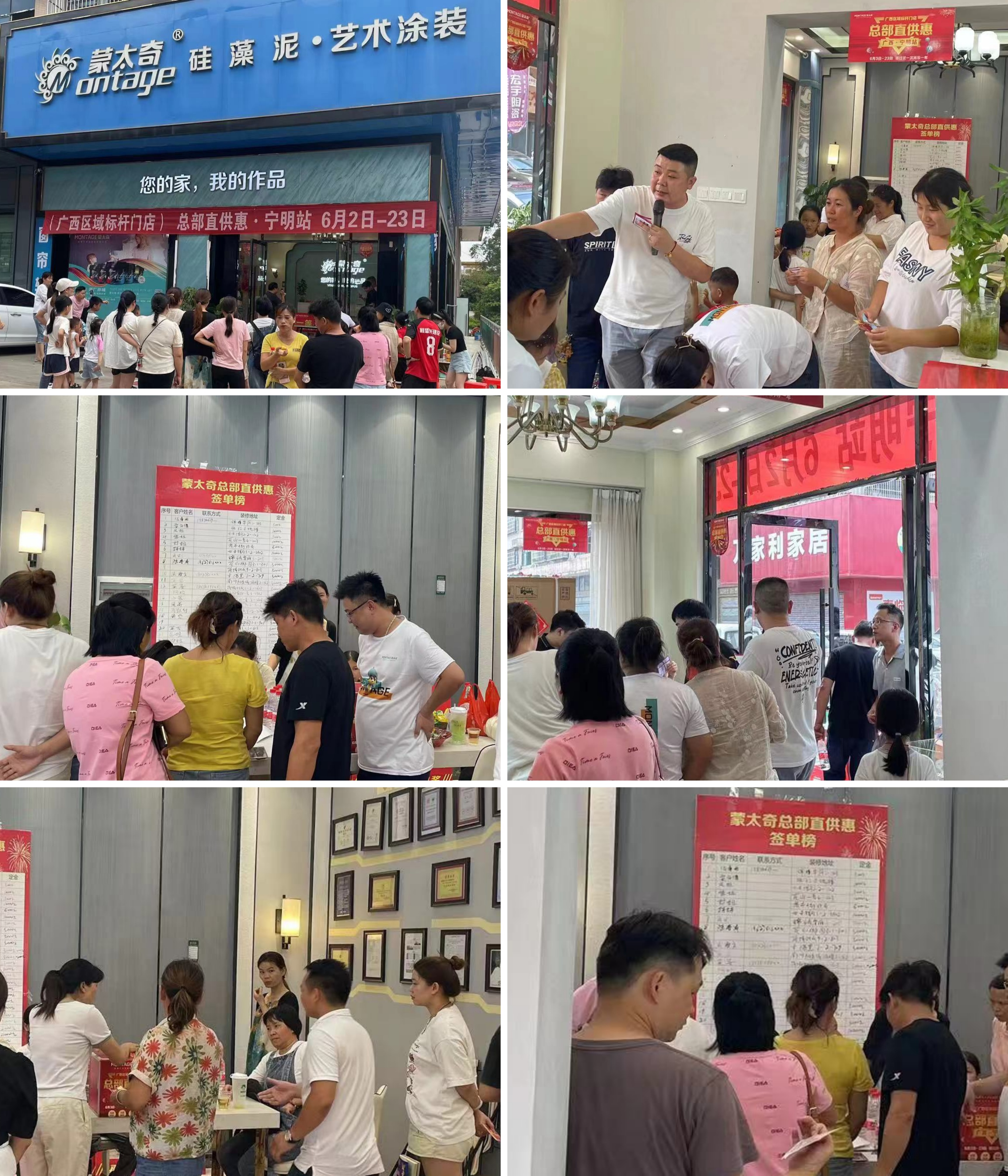 6月3-6月23日,蒙太奇推出年中重磅活動“狂歡618·送福到家”活動。此次活動,總部給予多項賦能政策,為了確保這次618活動能取得成功,蒙太奇在活動啟動前就進行了全面的規劃和部署。其中廣西寧明店作為廣西區域標的桿門店,蒙太奇總部和廣西寧明店聯動展開活動,以“總部直銷惠”為活動主線,進行終端單店活動。